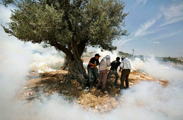 Протестующие под оливковым деревом в облаках слезоточивого газа. Kevin Frayer/AP.
