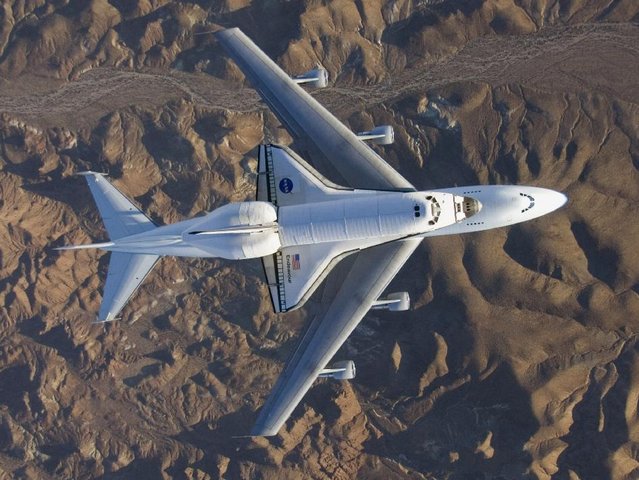 Шаттл Endeavour над пустыней Mojave во время транспортировки на космодром Кеннеди во Флориду.