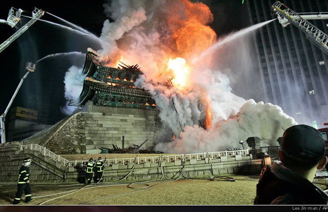 Южная Корея теряет национальную реликвию номер 1: ворота Namdaemun охватил пожар. Полиция утверждает, что поджог совершил 69-летний злоумышленник. "Namdaemun" - "Большие южные ворота" были построены в стене, окружавшей Сеул во время Династии Joseon. Их постройка началась в 1395. Lee Jin man/AP.