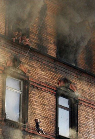 Девятимесячная Onur Celar падает из окна 4-го этажа здания, охваченного пожаром. Полицейские благополучно поймали девочку. Rene Werse/AFP Getty Imagesy.