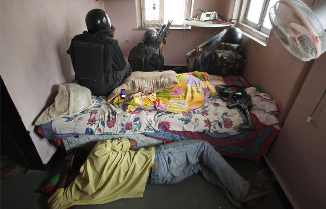 Местный житель прячется для возможного ответного огня, в то время как коммандос из National Security Guard, засев в его жилище, стреляют в боевиков, скрывавшихся в Nariman House. AP Photo/Saurabh Das.