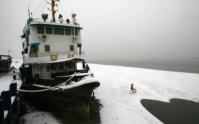 Пловец на берегу реки Янцзы. В результате сильнейшей засухи уровень воды в реке упал до рекордно низкой отметки за 142 года наблюдений. Reuters.